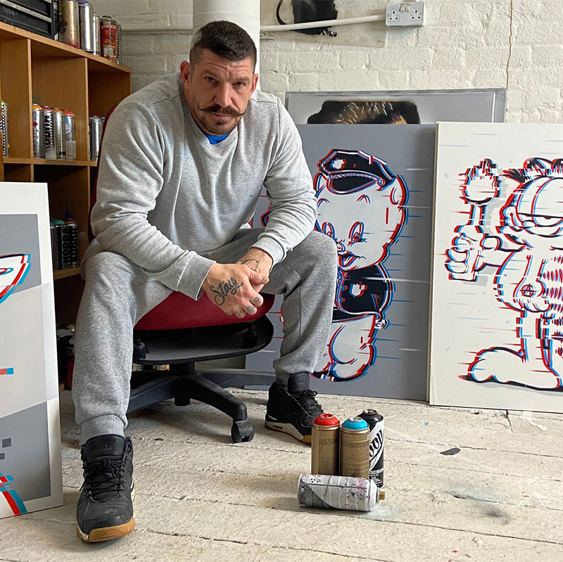 Eyesaw career spans over two decades he remains a highly active street artist who’s work can be found in most major cities across the uk. Eyesaw’s work draws inspiration from popular culture, iconic symbolism, typography, logo design, propaganda, and advertising. His most recent work incorporate a glitch aesthetic.